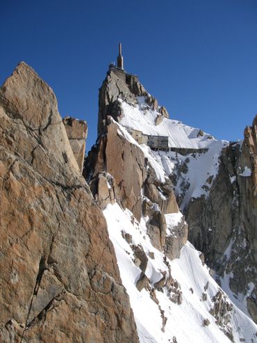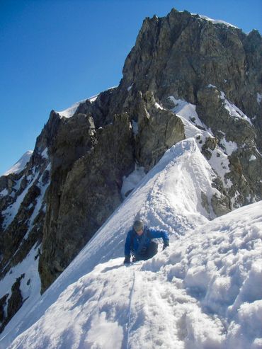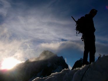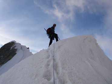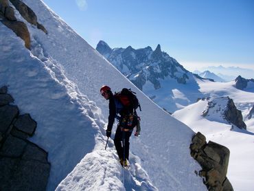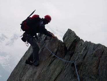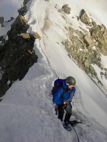 The Dent du Géant had been on our list from the start. The Giant's Tooth. A striking rock spire rising above 4,000 metres on the Italian border, its profile unmistakable against the skyline. The approach required taking the cable car up from the Italian side to the Rifugio Torino, on the opposite side of the mountain from the Aiguille du Midi. From there we camped on the glacier, setting the tent on the ice as the light faded and the temperature dropped. We were up before dawn. The route meant traversing a ridge for several hours above the glacier, working our way across exposed terrain high above the Aiguille du Midi before the rock climb itself even began. To move as light as possible on the granite, we left our bags and snow boots at the base. There was no point carrying extra weight up 300 metres of vertical rock.