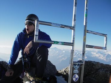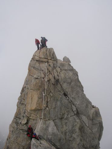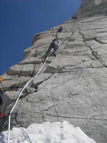 The climb itself was everything we had hoped for. Seven or eight pitches, each one 30 to 40 metres, working our way up the face with the glacier dropping away beneath us. The kind of climbing where you are entirely focused on what is in front of you, hands and feet finding the route, the world shrinking to the next hold, the next piece of protection, the next anchor. By the time we reached the top and completed the traverse across the twin summits, we were buzzing. Then we noticed the sky.