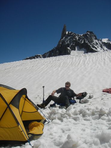The lift passes were expensive, so we worked around them the way students do. We would load up with as much food as we could physically carry, head up onto the glacier, and camp up high for three or four days at a stretch, climbing routes on the ice and rock until the food ran out. Then we'd come back down, restock, recover, and go again. Between the mountain stints, we lived in the valley, pitching the tent at the campsite, eating spaghetti with sauce from a jar, drinking the cheapest French beer we could find, and climbing routes on both sides of the valley. It was a proper student existence, and we loved every moment of it.